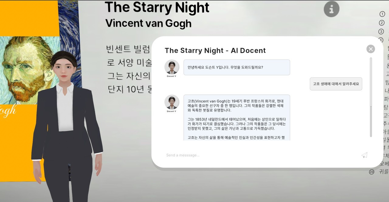 특히 관람객에 전시물을 설명하는 안내인 도슨트(Docent)를 AI로 구현했다. 챗GPT를 탑재한 도슨트는 관람객의 예상치 못한 심도 있는 질문에도 최적의 답변을 내놓는다는 설명이다. 전시와 관련된 답만 제공하기 위해 학습, 미세 조정의 과정을 거쳤다고 전했다.