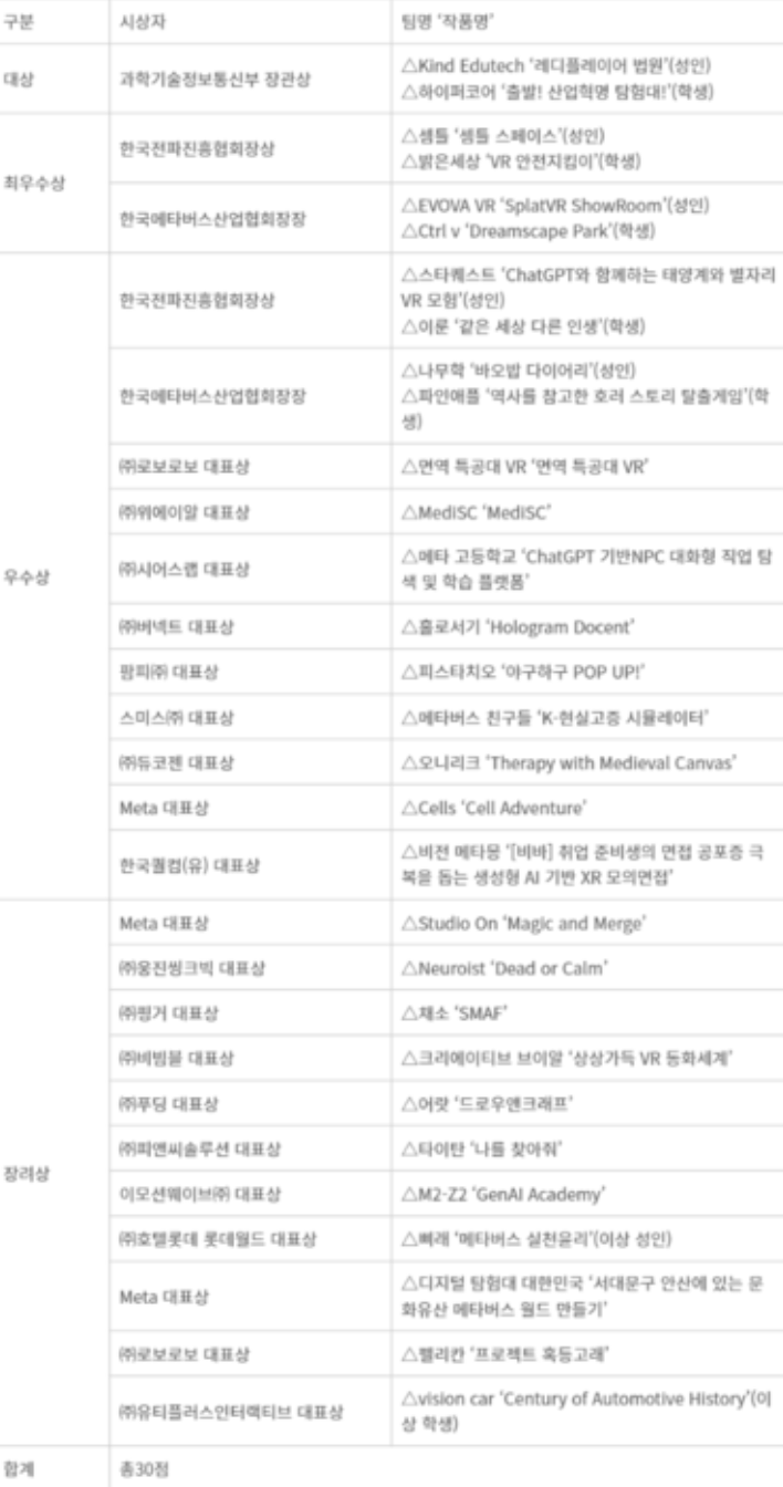 상금 2000만원이 주어지는 대상(과기정통부 장관상) 영예는 성인부문 'Kind Edutech' 팀의 '레디플레이어 법원'과 학생부문 '하이퍼코어' 팀의 '출발! 산업혁명 탐험대!'가 각각 차지했다. 최우수상(한국전파진흥협회장상)은 △셈틀 '셈틀 스페이스'(성인) △밝은세상 'VR 안전지킴이'(학생)이 각각 수상했다.