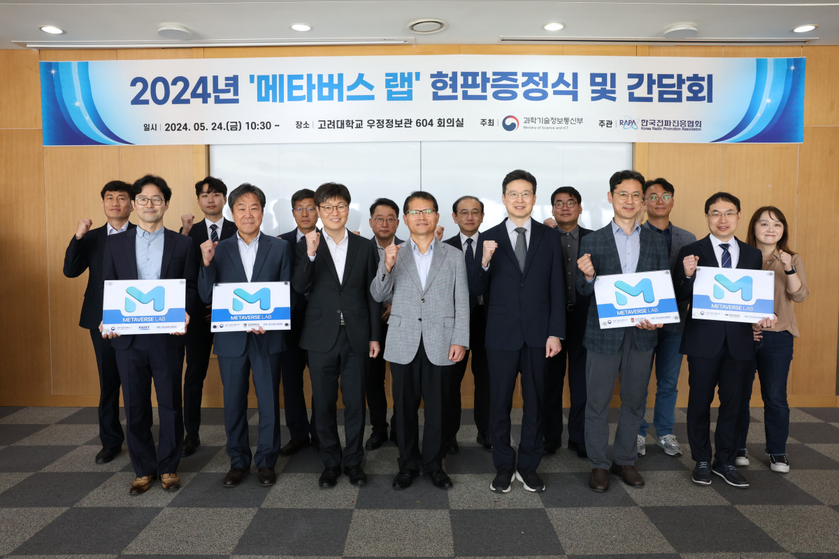 과학기술정보통신부(장관 이종호, 이하 ‘과기정통부’)는 2024년 ‘메타버스 랩(가상융합세계 연구실)’ 지원 사업에 신규 선정된 고려대, 서강대, 홍익대(세종), KAIST의 4개 연구실에 현판을 증정하고, 금년도 연구계획을 공유하는 착수회의를 5월 24일(금)에 고려대에서 개최하였다.