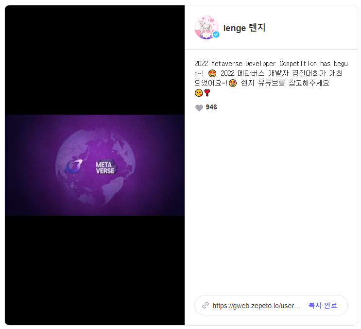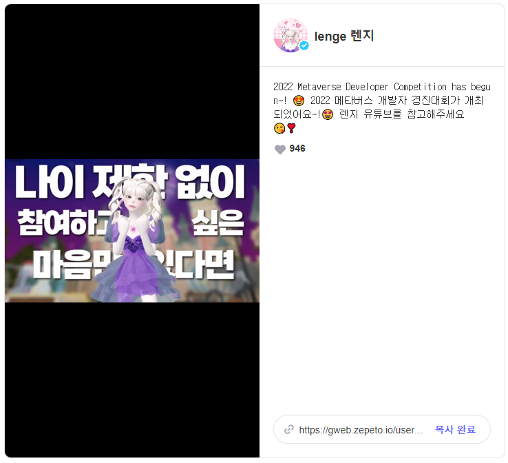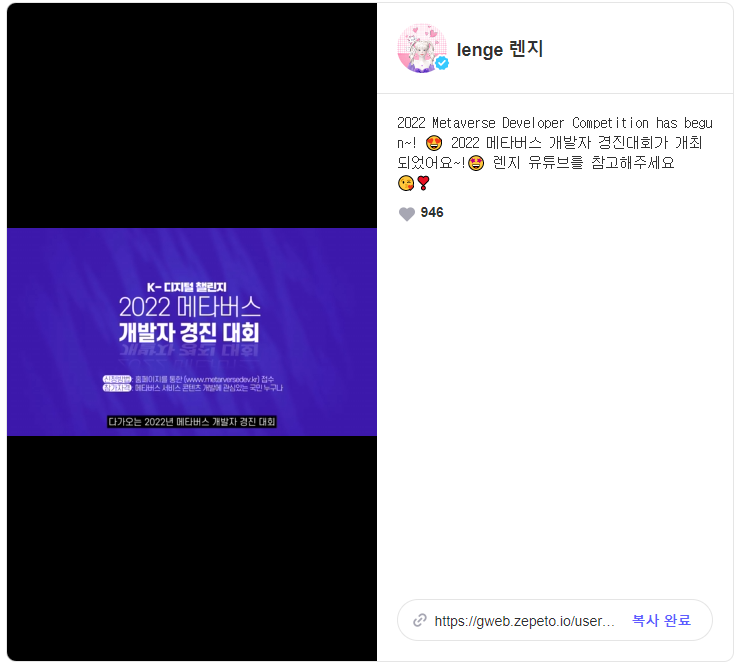 [제페토 크리에이터 '렌지' 2022 메타버스 개발자 경진대회 게시(바로가기)]