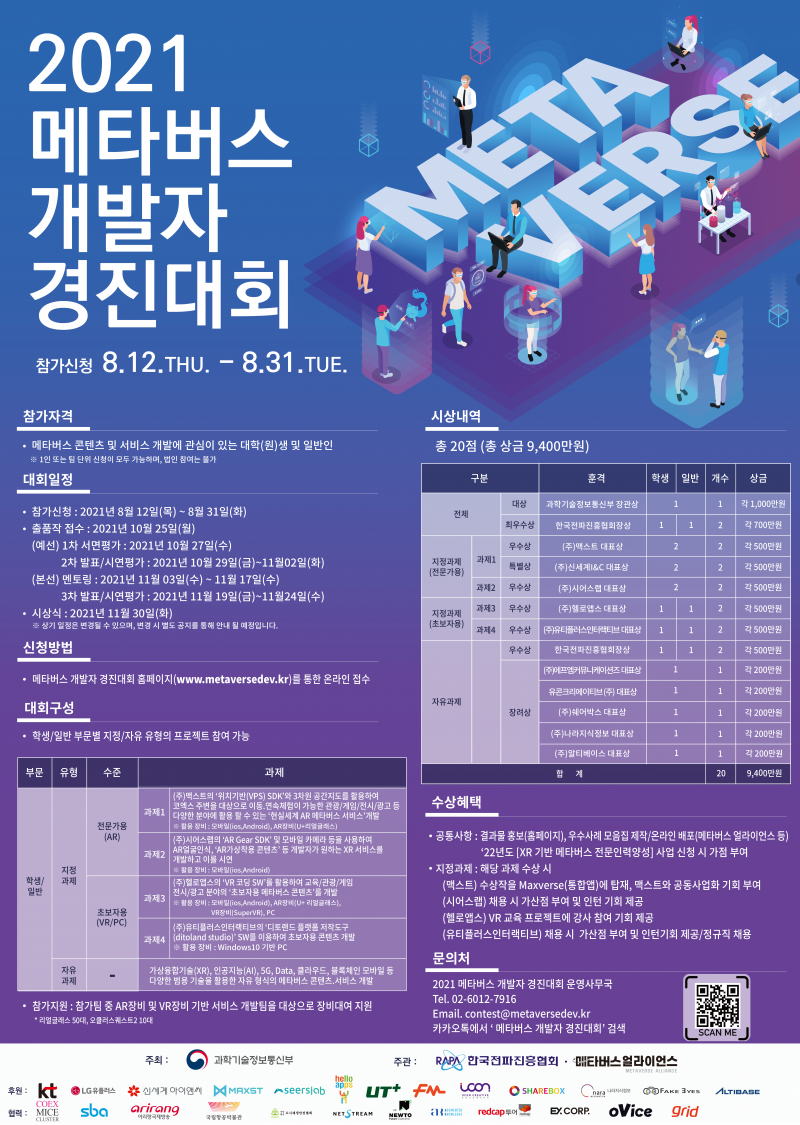 본 대회는 메타버스 얼라이언스 후속조치 일환으로 메타버스 산업 생태계 활성화 및 창의적인 메타버스 개발인력 양성을 목적으로 하고 있습니다.